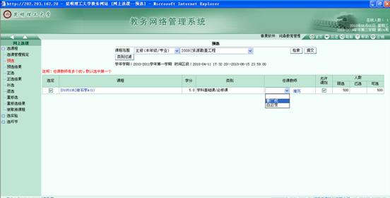 1.预选工作的主要任务是让学生在下学期开设的若干门选修课中自主选择课程,或在同一门课程的若干任课教师中自主选择任课教师。特别提醒: