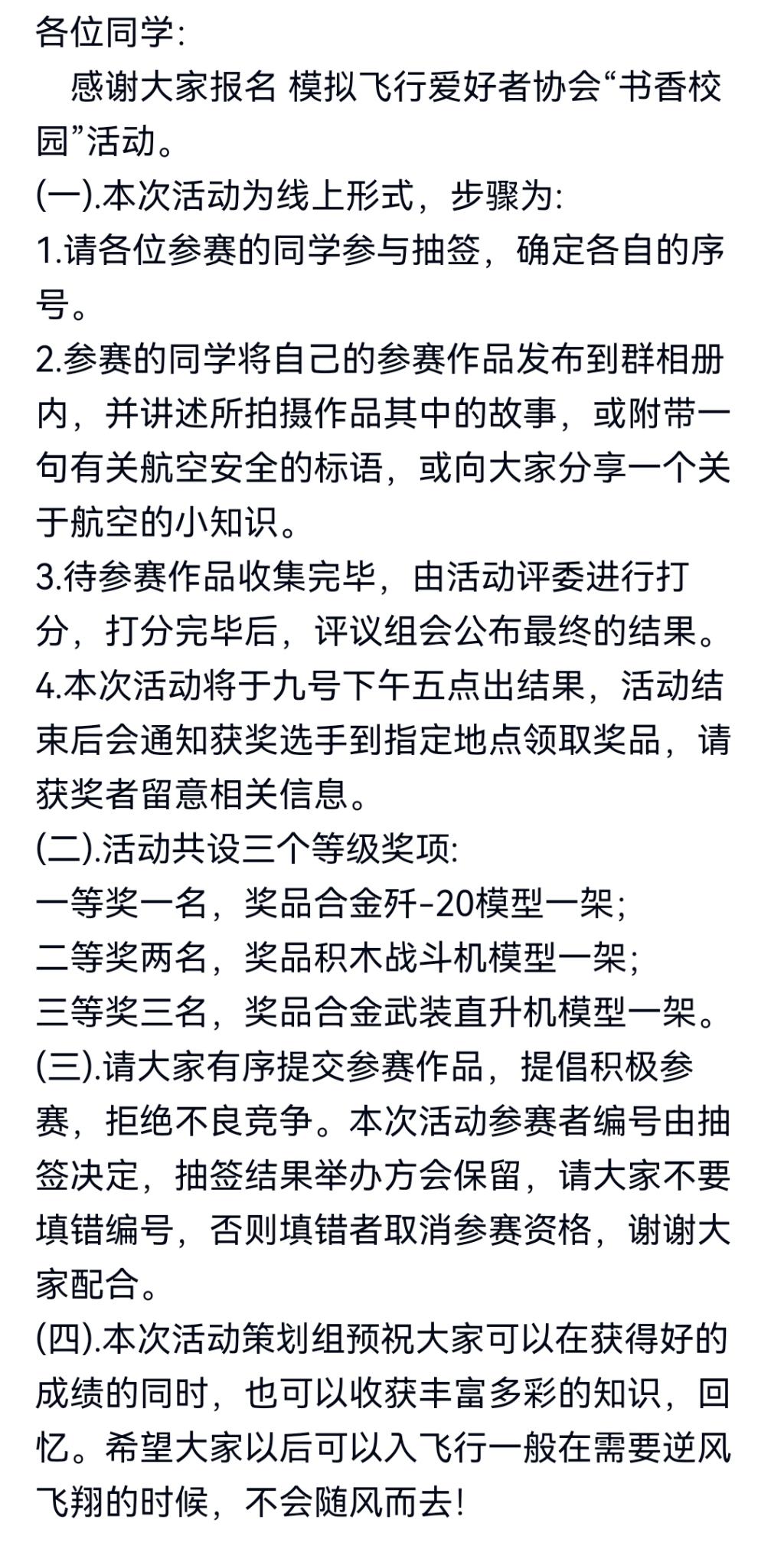 本次活动通过线上活动群开展,每位参与同学积极分享航空知识、标语或图片承载的回忆。活动期间由社团负责人每天进行航空知识普及,通过问答、交流等方式与参与活动的同学积极交流,活动结束后评选出六份优秀作品。最终吴尚胤同学获得了本次比赛的一等奖,刘森一及高田同学获得了二等奖,叶柯希、尹湘、谭雪涛同学获得了三等奖。
