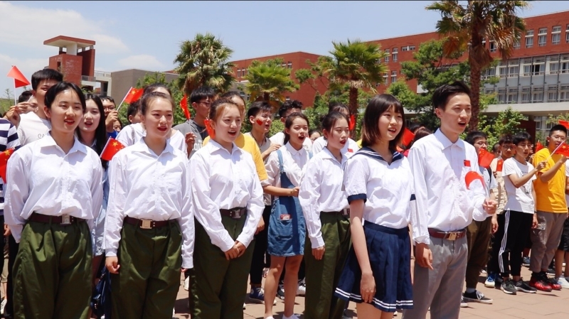 舞蹈结束,熟悉的旋律《我和我的祖国》响起,四名领唱从人群中走出,她们用热情洋溢的歌声唱起《我和我的祖国》,以歌声诉说对祖国的敬爱之情。受现场气氛感染,越来越多的师生加入到活动中,随着歌声挥动手中的小红旗,一同高歌,“我和我的祖国,一刻也不能分割,无论我走到哪里,都流出一首赞歌……”歌曲唱毕,大家一同高呼“我爱你,祖国!”。