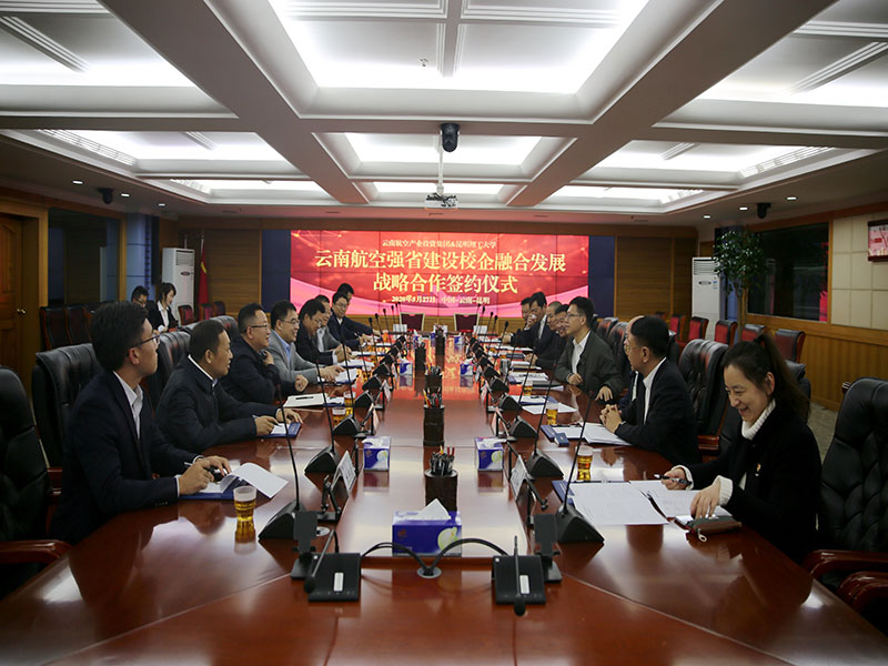 5月27日,我校与云南航空产业投资集团有限责任公司在昆明举行签约座谈会,航产投集团公司党委书记、总裁李刚与校党委副书记、校长王学勤代表两家单位共同签署《云南航空强省建设校企融合发展战略合作框架协议》,航产投集团公司副总裁罗金生、副校长束洪春,我校校办、校友及社会合作办、性吧 及航产投相关部门负责人参加会议。