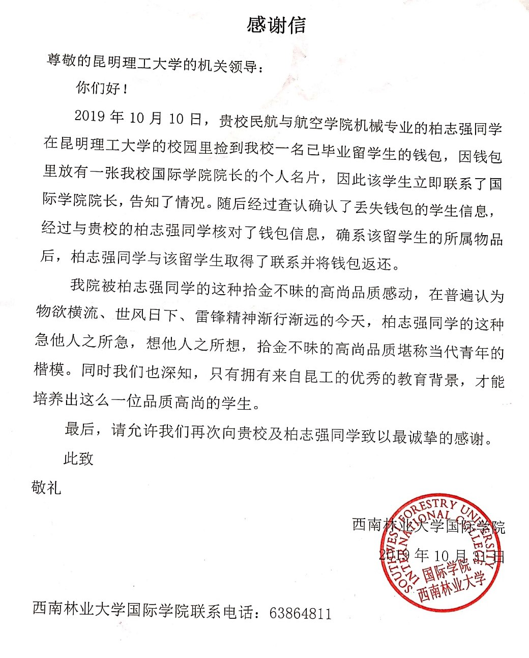 拾金不昧是中华民族的传统美德,是高尚道德情操的体现,也是党员践行初心使命的具体体现。近日,性吧 收到来自西南林业大学国际学院的一封《感谢信》,信中大力称赞2016级学生柏志强拾金不昧的高尚品质。