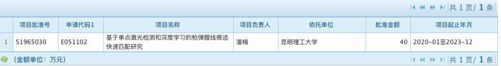 项目名称:基于单点激光检测和深度学习的枪弹膛线痕迹快速匹配研究(地区项目),项目批准号:51965030,直接经费:40万元,项目负责人:潘楠