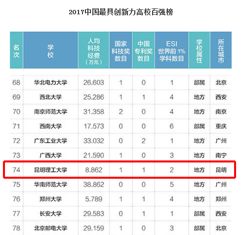 4月18日,标准排名联合优客工场发布了“2017中国大陆最具创新力大学百强榜”,性吧 位列74位,是云南省唯一上榜高校。该排行榜统计了人均科研经费、国家科技奖数目、国家专利奖数目、ESI世界前1%学科数等方面数据。清华大学、浙江大学和北京大学位居前三位。