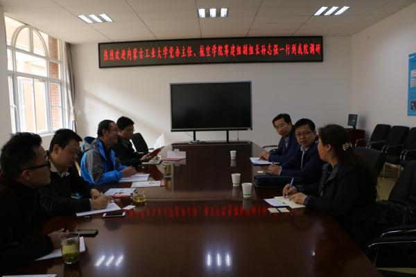 4月13日上午,内蒙古工业大学党政办主任、航空学院筹备组副组长孙志强、教务处长李春萍一行到航空学院调研座谈,航空学院常务副院长沈颖刚陪同调研并主持座谈会,综合办主任阳照冬、教务办主任朱兴东等参加座谈会。