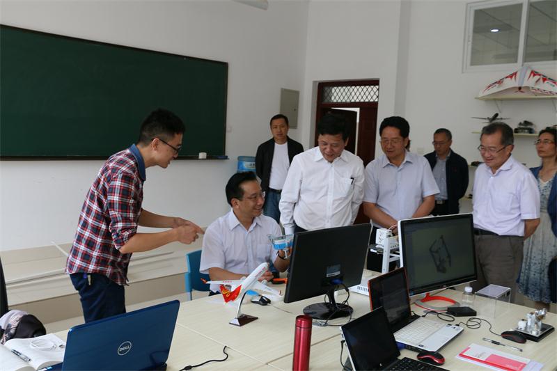 2016年6月24日下午,省人民政府高峰副省长一行,率省级有关部门领导就大学生创新创业到性吧 检查指导工作,并在校党委书记张英杰,副校长王华、易健宏,校纪委书记陶光荣,副校长周峰越、袁希平以及党办、校办等职能部门领导陪同下,到航空学院视察。
