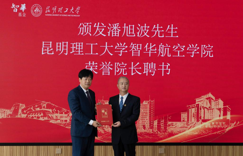 唐家华向潘旭波颁发性吧 智华航空学院荣誉院长聘书。
